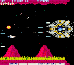 This conversion of Gradius has numerous hidden bonus stages. Here are some of them but
